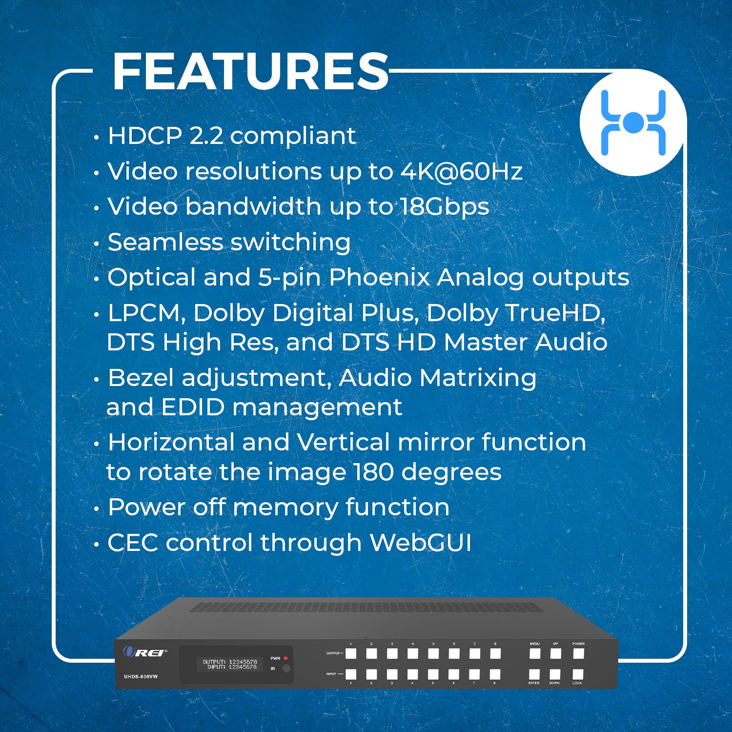 Extract audio from any HDMI source with optical and 5-pin Phoenix analog outputs, or manage sound routing directly through the WebGUI. With support for premium audio formats including Dolby TrueHD, DTS HD Master Audio, and LPCM, the unit offers advanced integration with external audio systems. It's a comprehensive solution for installations that require both video wall matrix control and flexible sound distribution.