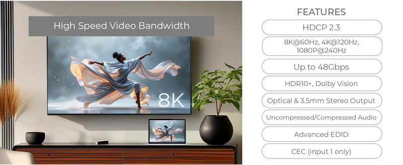 It supports video resolutions up to 8K@60Hz, 4K@120Hz, and 1080p@240Hz with full HDMI 2.1 and HDCP 2.3 compliance. With a total video bandwidth of 48Gbps, it delivers crisp, high-resolution video with support for HDR content for vivid and lifelike visuals.