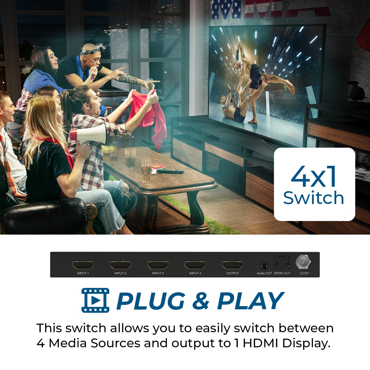 The BK-41A HDMI Switch lets you connect up to four HDMI sources to a single display, offering flexible input switching through the front panel or the included remote control.