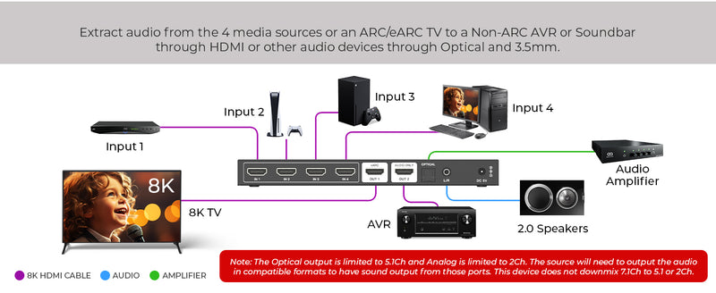 This HDMI switch doubles as an audio hub, with audio de-embedding support through SPDIF (optical), 3.5mm analog, and a dedicated HDMI audio-only output. Use it to send sound to non-ARC AV receivers, external speakers, or headphones without needing additional gear. It supports Dolby Atmos, DTS:X, LPCM 7.1, and other high-end formats. With eARC compatibility, you can return TV audio directly to soundbars like Sonos ARC for immersive sound.