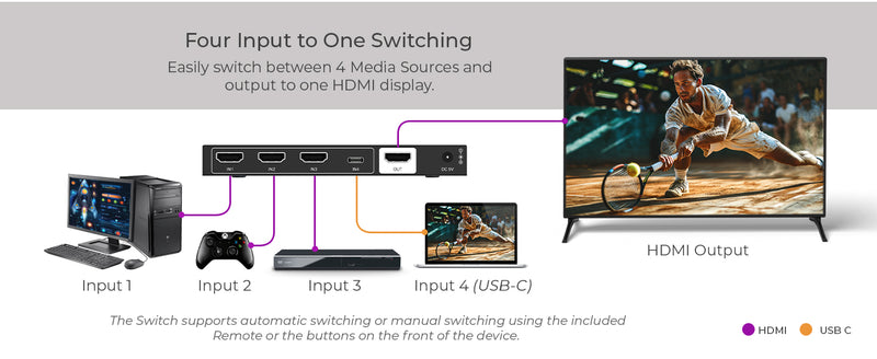 The BK-401C is a versatile 4x1 HDMI and USB-C switch, with HDMI 2.1, HDCP 2.3, and DisplayPort 1.4 compliance to connect multiple media sources to a single display with effortless switching and high-performance video output.