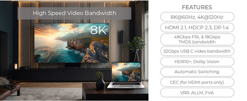 48Gbps FRL, 18Gbps TMDS and 32Gbps USB-C Video Bandwidth – Ensures smooth signal transmission from all inputs.