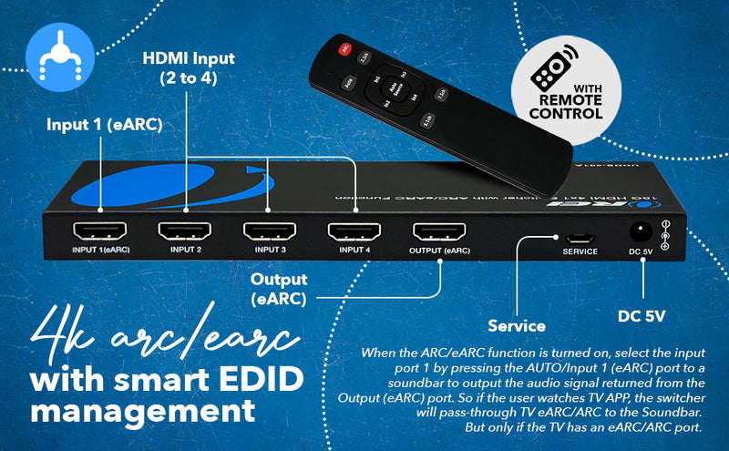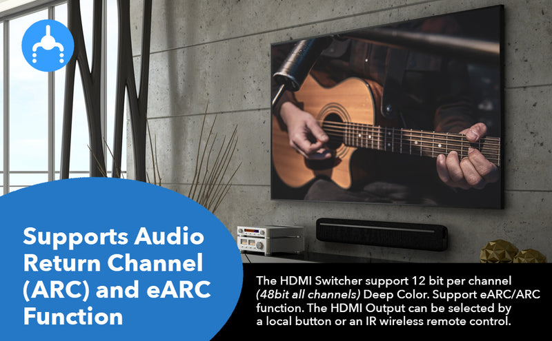The switcher also integrates Audio Return Channel (ARC) functionality, allowing audio from an ARC-enabled TV to be routed back to an external receiver or amplifier. Smart EDID management (Auto/2CH/5.1CH/7.1CH selectable) ensures seamless system compatibility, while input sources can be switched automatically or manually via the front panel or IR remote control. Front panel indicator LEDs provide clear status feedback for ease of use.