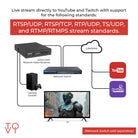 - Streaming Protocols – RTSP/UDP, RTSP/TCP, RTP/UDP, TS/UDP, RTMP/RTMPS.