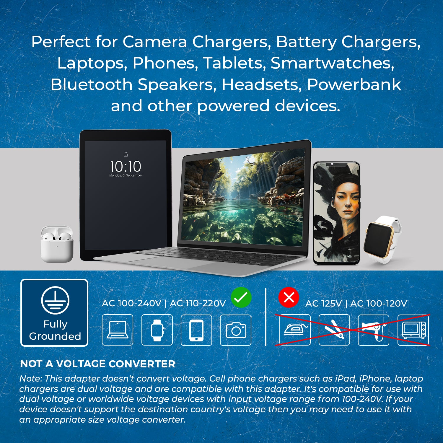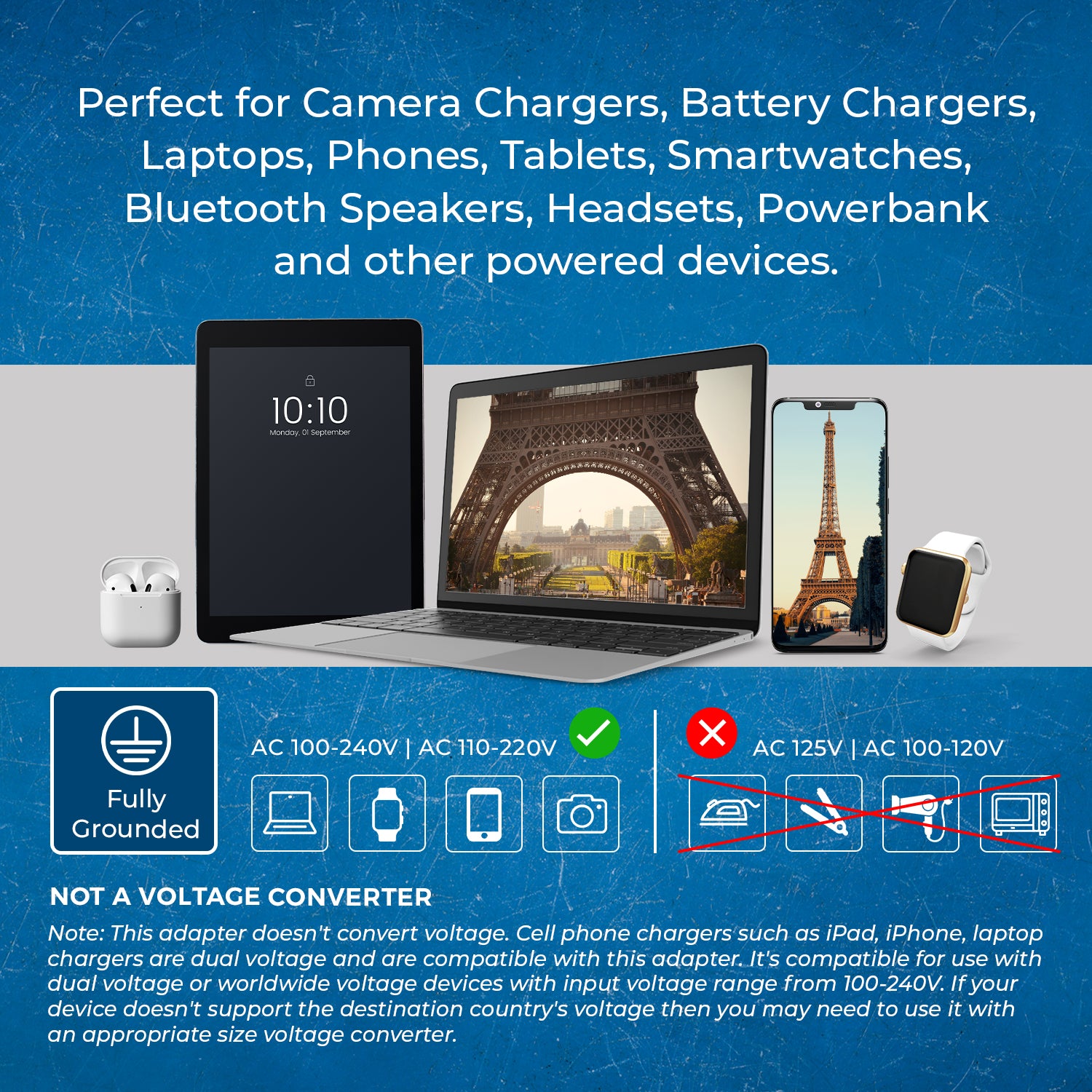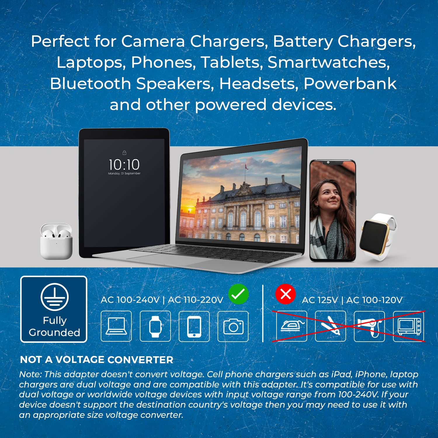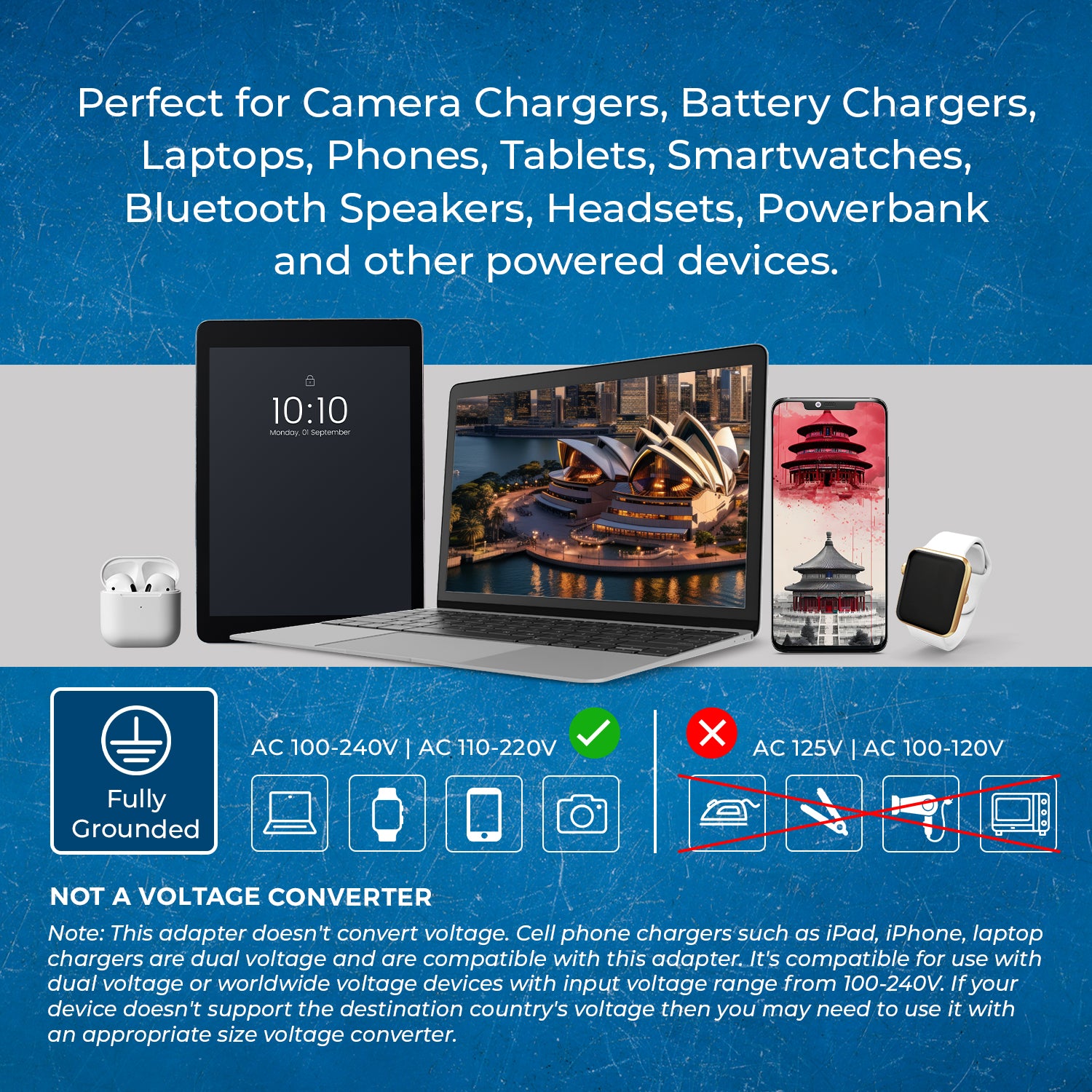 Not always. Electronics like cell phone chargers or laptop chargers are designed to operate on a wide range of voltages, ranging from 100 to 240V or 120 to 240V. This means that a travel adapter plug will provide enough power to your device, regardless of the country you’re in. However, a lot of electronics sold in North America run only on 120V. This means that you will need a voltage converter when travelling to countries where the output is 220V (which is most of the world). OREI Travel Adapters don’t convert voltage, so confirm the input voltage rating on your device prior to travelling to determine if you need a converter on your trip.