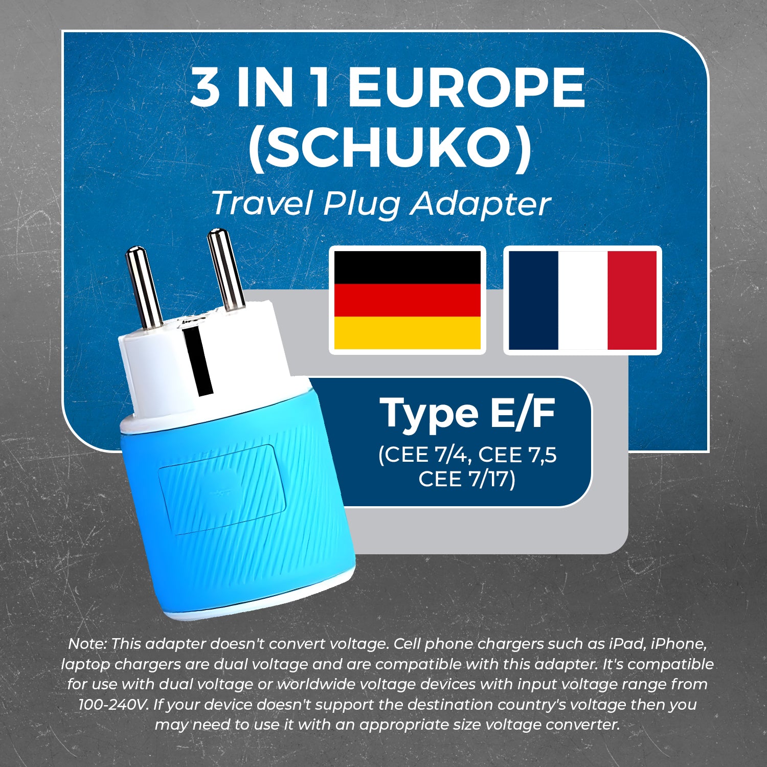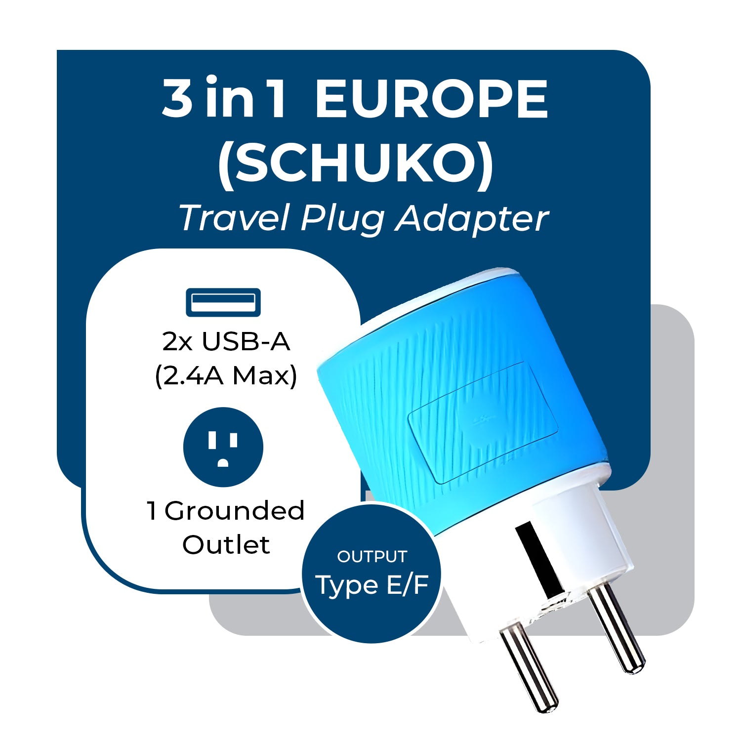 Single Country adapters (both Single Country - DB Series and Single Country with USB port - U2U Series) work for just one type of outlet - though that one type could be compatible with multiple countries. The Single Country adapter accepts two standard plugs while the Single Country with USB port adapter accepts one standard plug and one USB connector. M8 and M8 Max adapters work for multiple countries (see the product specs for the full country list). The M8 has sliding prongs that can be selected based on the destination country. It has 4 plug types - A, C, G, and I. The M8 accept three devices - one standard plug (from any country except South Africa Type M plug) and two USB devices. The M8 Max comes with 2 US standard outlets, 3 USB A and 1 USB C ports. It comes with interchangable plug attachments so you can just change the plug based on the country you are travelling to and not have to buy a different adapter every time. The difference between the M8 and the M8 Max is that the M8 has a grounded universal outlet, while the M8 Max has grounded US outlets only. The M8 offers 4 plug types but the M8 Max offers all plug types.