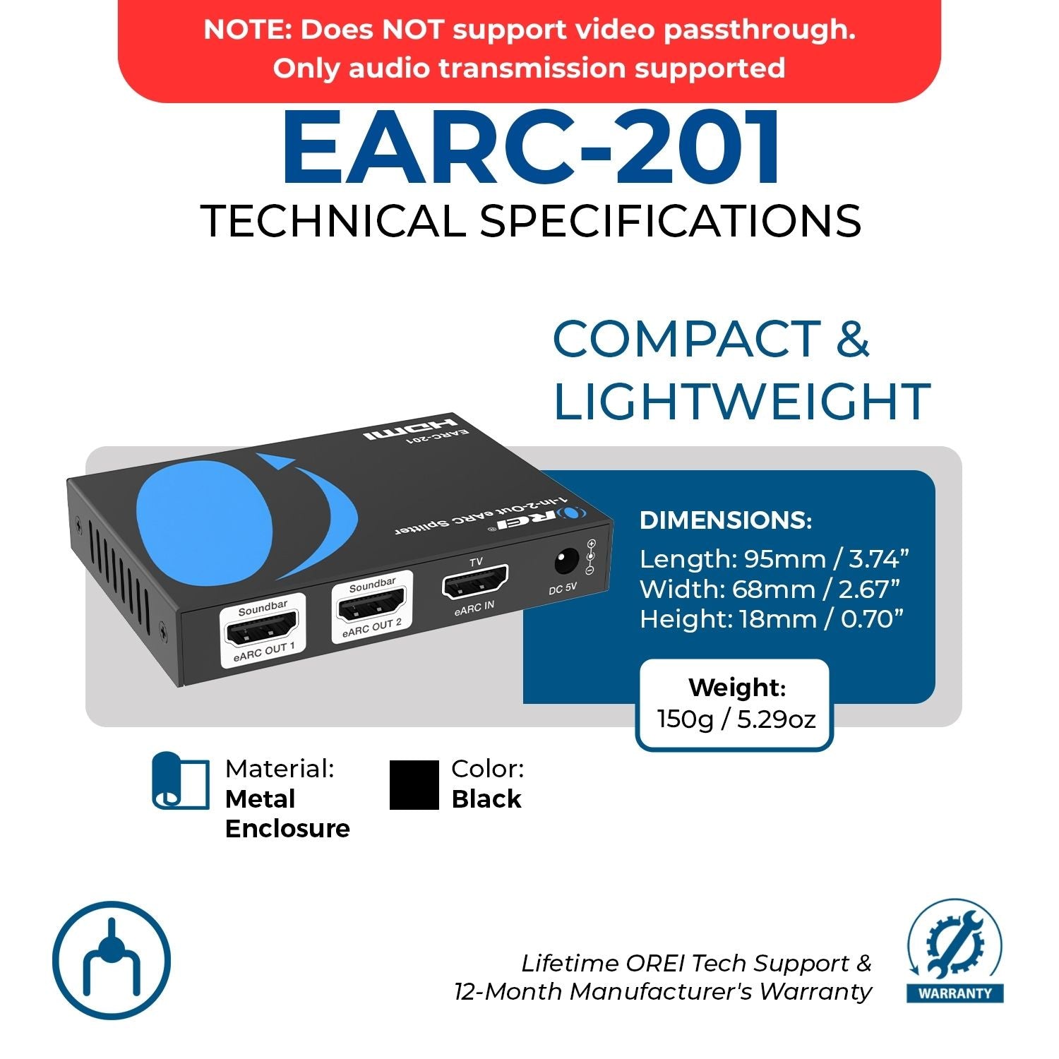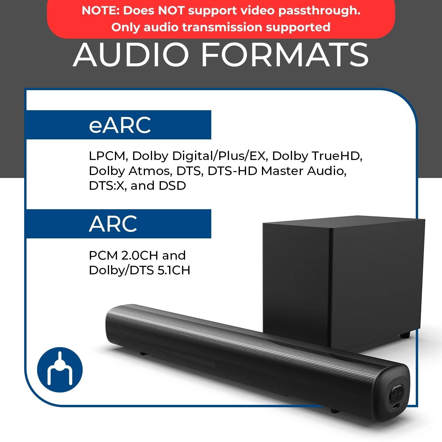 Supporting advanced audio formats such as LPCM, Dolby Digital/Plus/EX, Dolby TrueHD, Dolby Atmos, DTS, DTS-HD Master Audio, DTS:X, DSD, and more, the EARC-201 ensures compatibility with the latest surround sound technologies. For ARC connections, it supports PCM 2.0CH and Dolby/DTS 5.1CH. (NOTE: Does NOT support video passthrough. Only audio transmission supported.)