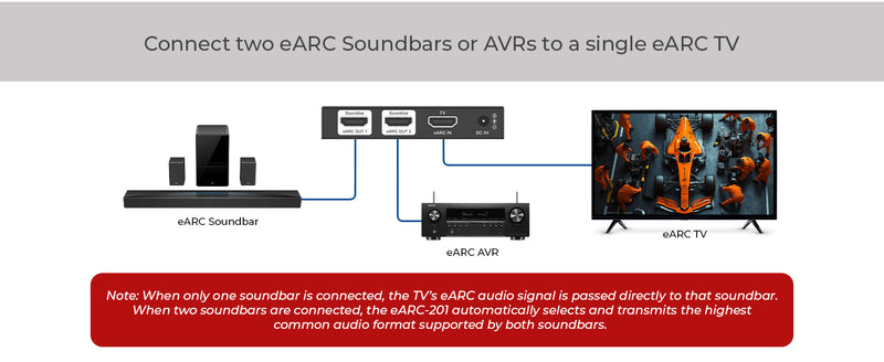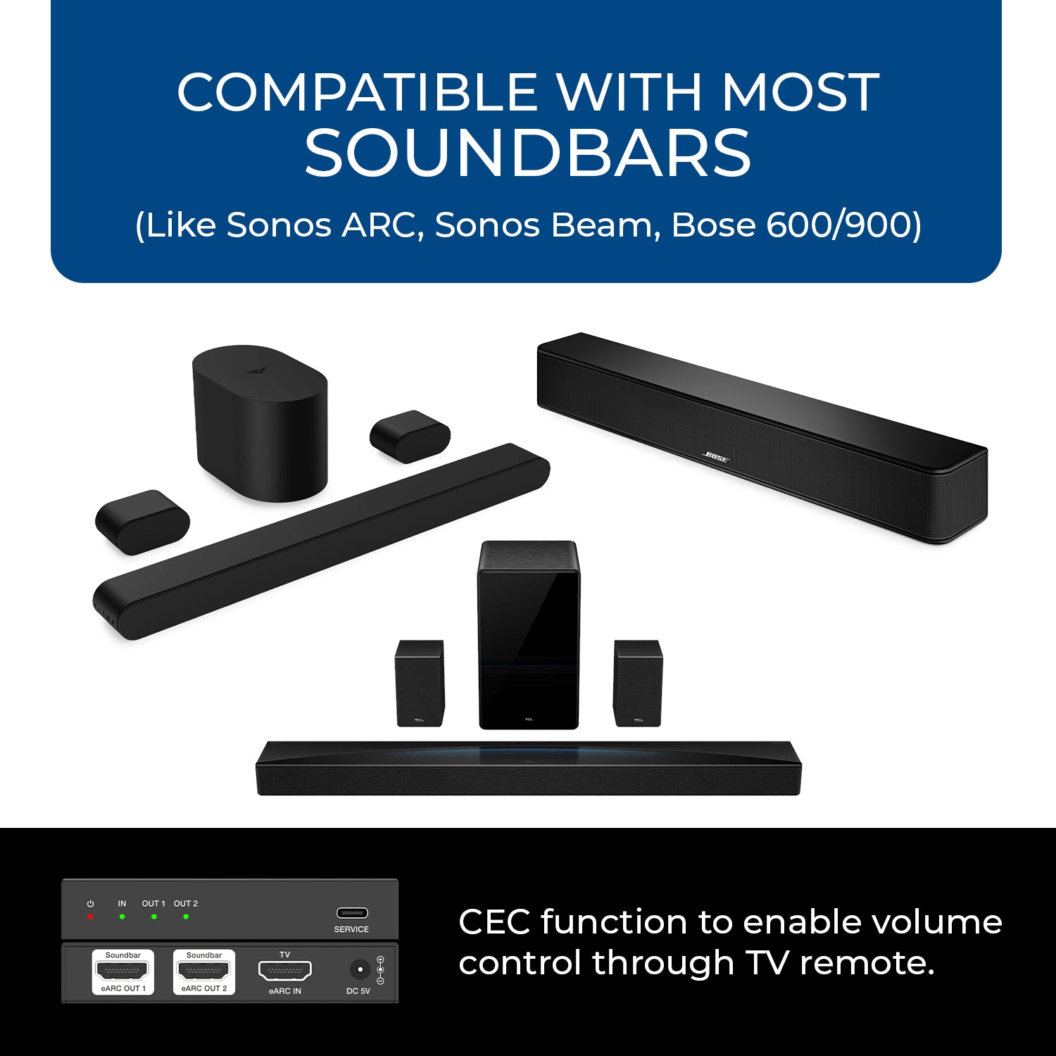 ARC/eARC Functionality – Splits audio signals returned from TV to two soundbars or audio systems.