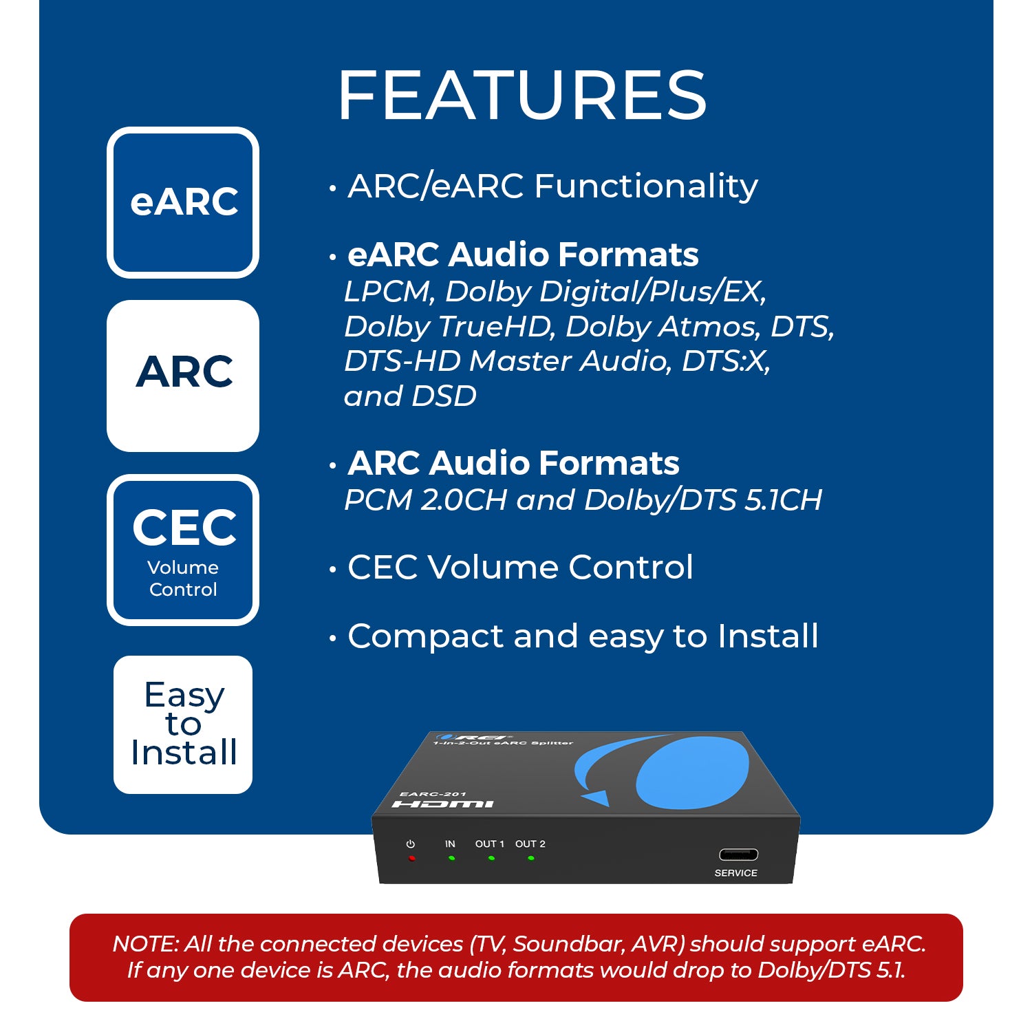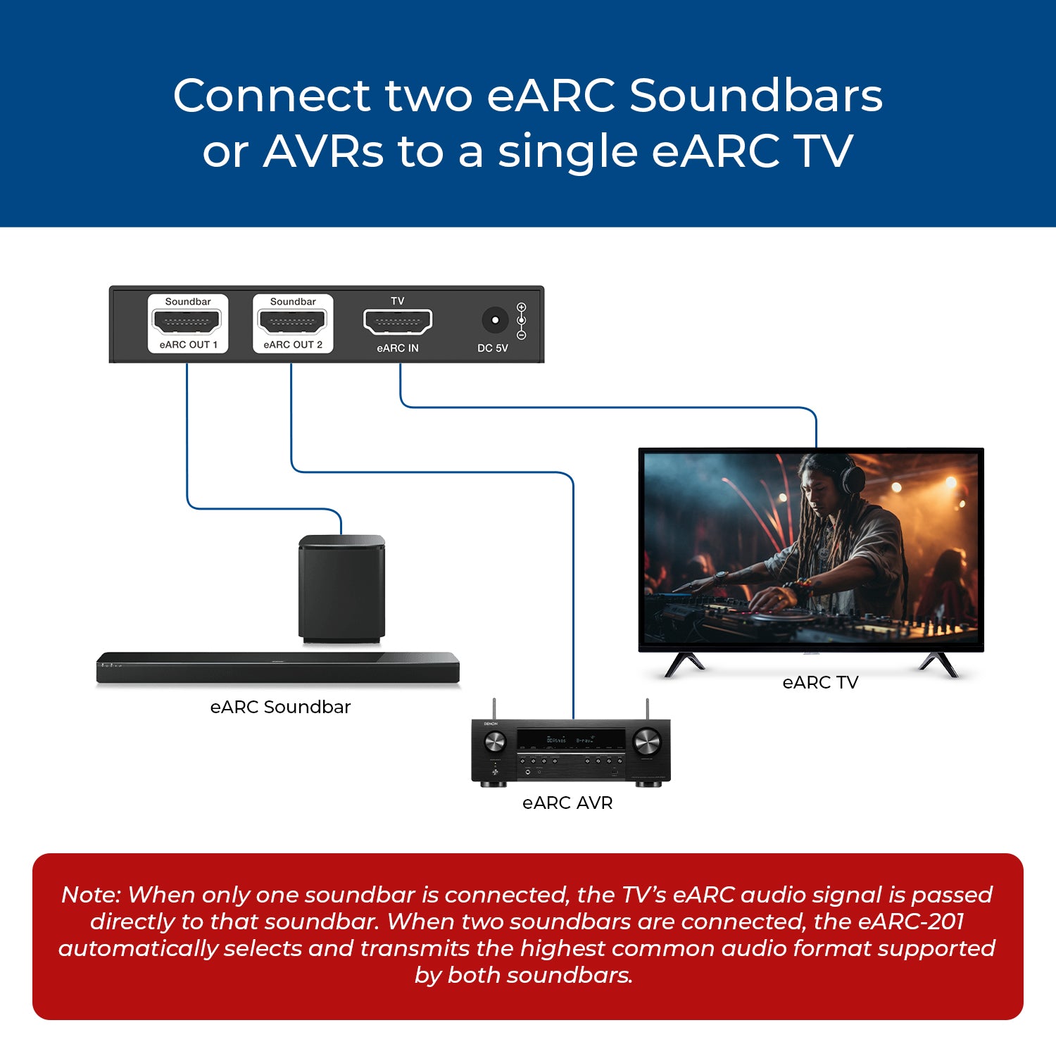 The EARC-201 is a high-performance ARC/eARC audio splitter designed to deliver premium multi-channel audio distribution. It allows the audio signal returned from a TV to be split and sent to two soundbars or other audio systems simultaneously, ensuring an immersive sound experience across multiple setups.