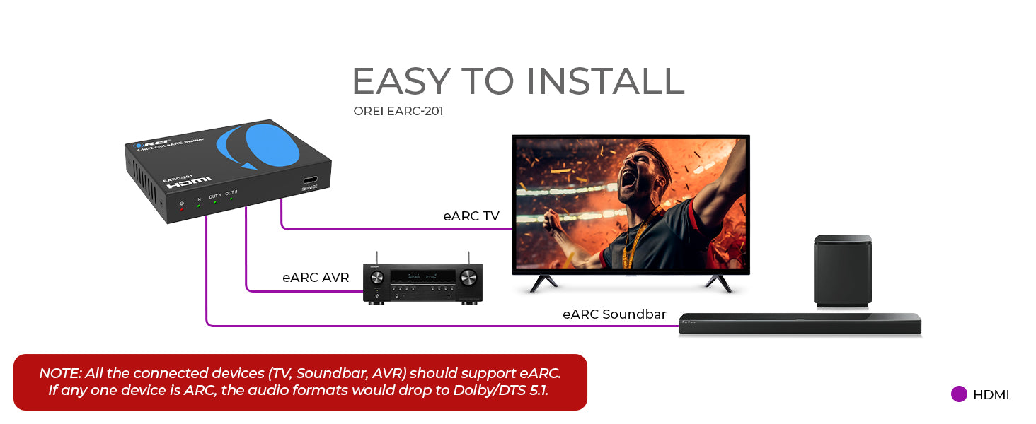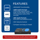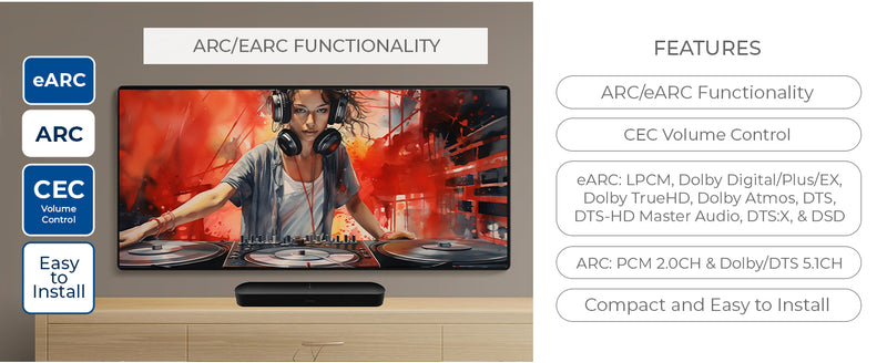 Supporting advanced audio formats such as LPCM, Dolby Digital/Plus/EX, Dolby TrueHD, Dolby Atmos, DTS, DTS-HD Master Audio, DTS:X, DSD, and more, the EARC-201 ensures compatibility with the latest surround sound technologies. For ARC connections, it supports PCM 2.0CH and Dolby/DTS 5.1CH.