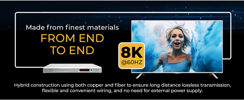 This advanced cable converts HDMI signals to optical signals, enabling the seamless transfer of uncompressed video and audio data with bandwidths of up to 48Gbps. Supporting resolutions up to 8K@60Hz 4:4:4 and fully compliant with HDMI 2.1 and HDCP 2.3 standards, it delivers lossless transmission with zero latency or interference.