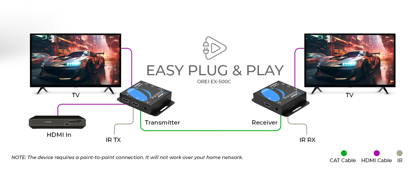 The EX-500C HDMI extender transmits full HD video and audio signals up to 150 meters (492 feet) using a single CAT 6/7 cable. Perfect for large venues, conference rooms, or residential setups, this HDMI via Ethernet solution ensures reliable signal delivery without the need for long HDMI cables.