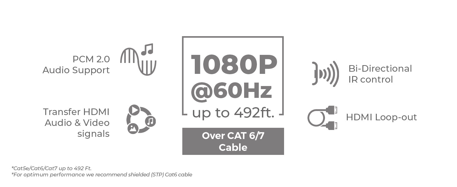 - Signal Extension up to 150m/492ft – Transmits video/audio over CAT 6/7 cable for long-distance applications.