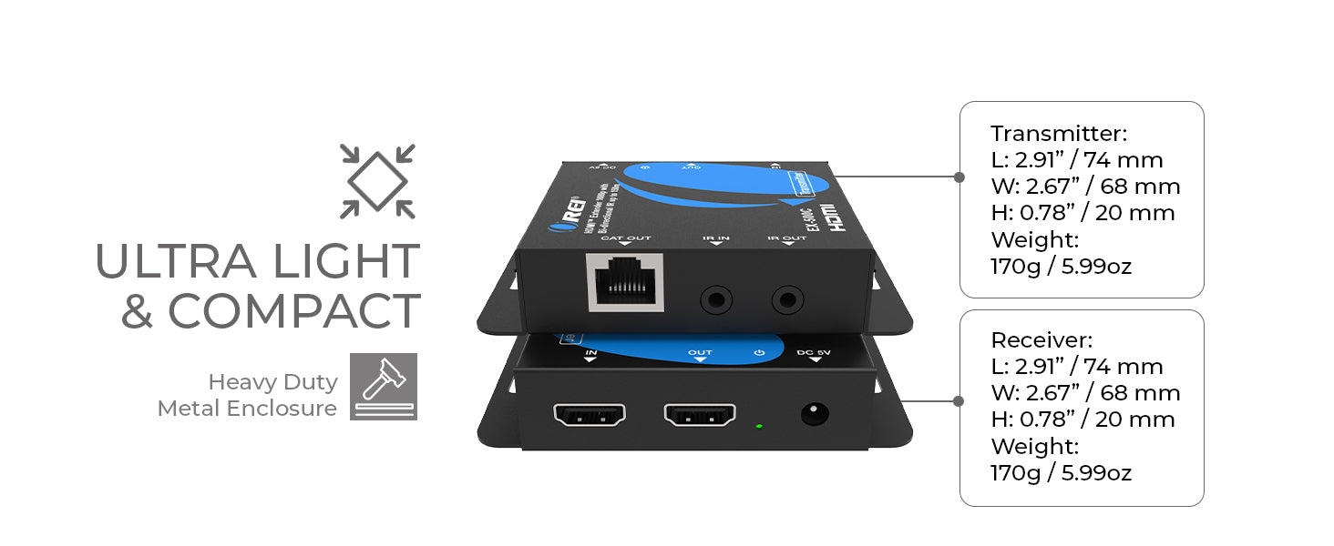 Compact and rugged, the EX-500C is built for demanding commercial use while remaining easy to integrate into tight spaces. Whether you're deploying a CAT 6 HDMI extender for signage, education, or home AV systems, this unit offers long-term performance with plug-and-play simplicity.