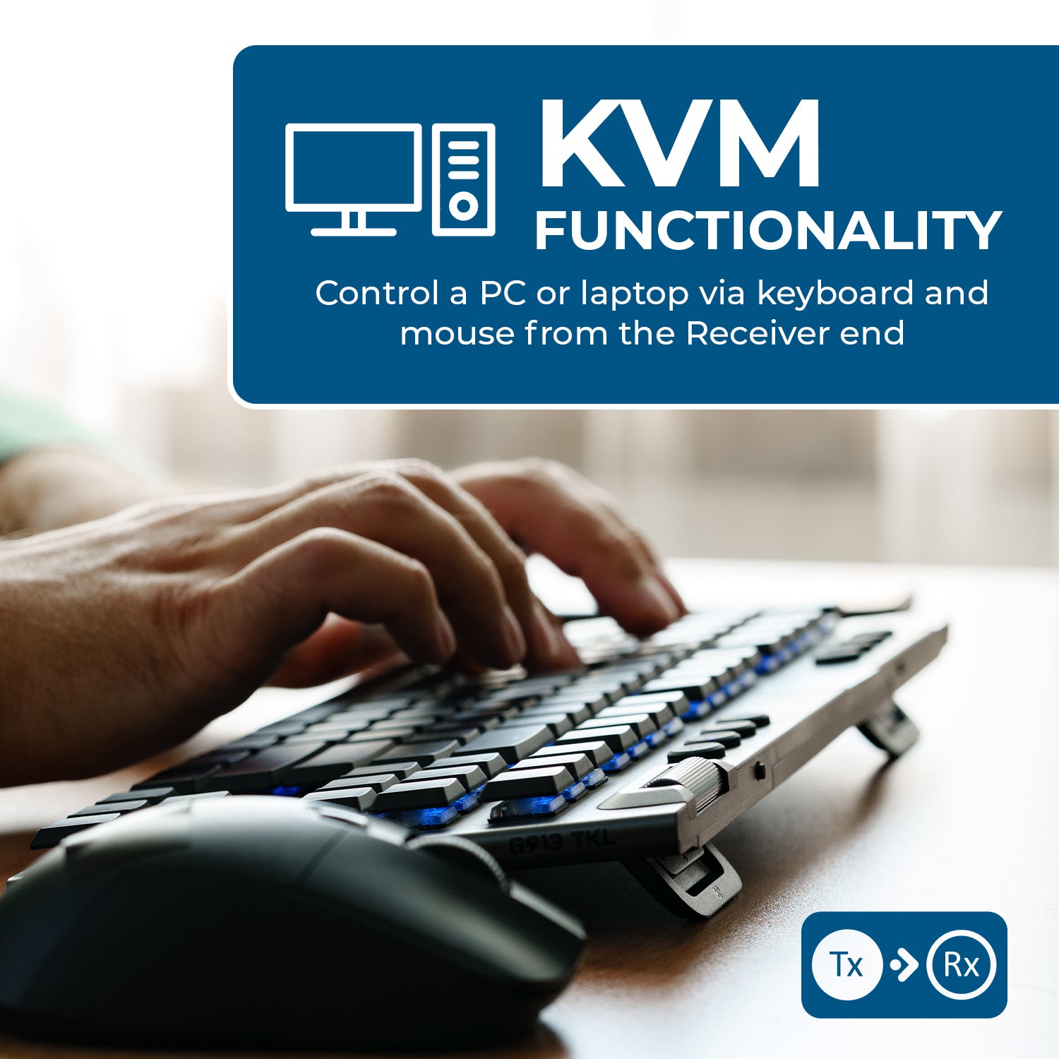This KVM extender 4K lets users control a remote PC using a USB keyboard and mouse at the receiver side—ideal for remote workstations, server rooms, or interactive displays. Combined with HDMI and USB over Ethernet capabilities, it provides a seamless user experience in office or commercial AV installations.