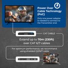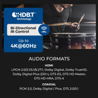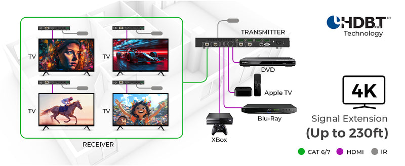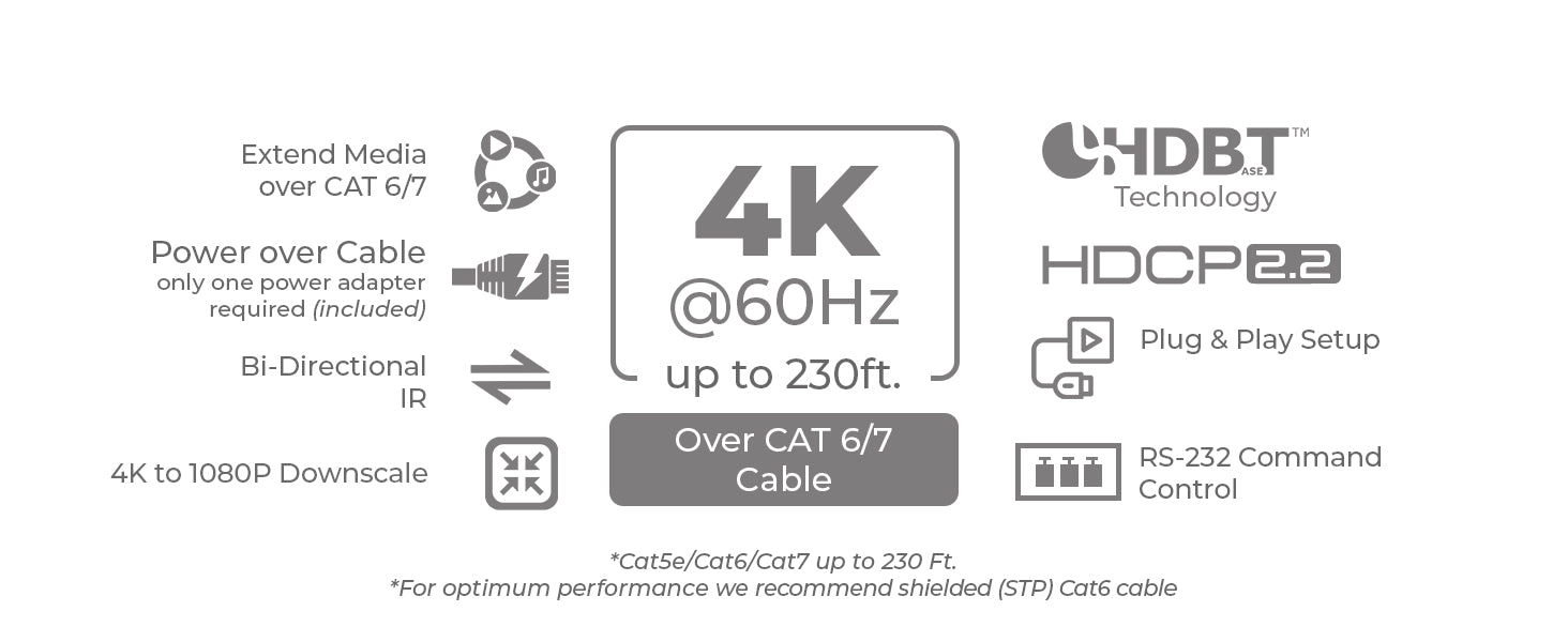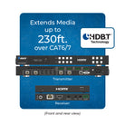 Using HDBaseT technology, the system extends HDMI signals up to 230 feet over a single CAT cable. It supports HDMI audio pass-through up to 7.1-channel HD audio, including LPCM, Dolby TrueHD, and DTS-HD Master Audio. Audio extraction is available via analog and coaxial outputs, following the selected video output (1–4), providing flexible audio routing options.