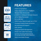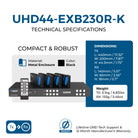 The UHD44-EXB230R-K features bi-directional IR, CEC control, advanced EDID management, and Power over Cable (PoC) technology, requiring only one power adapter for operation. It can be controlled via front panel buttons, IR remote, RS-232, LAN, or WebGUI, making it ideal for integrated control systems. Its rack-mountable design ensures seamless installation in equipment racks for both commercial and high-end residential AV environments.