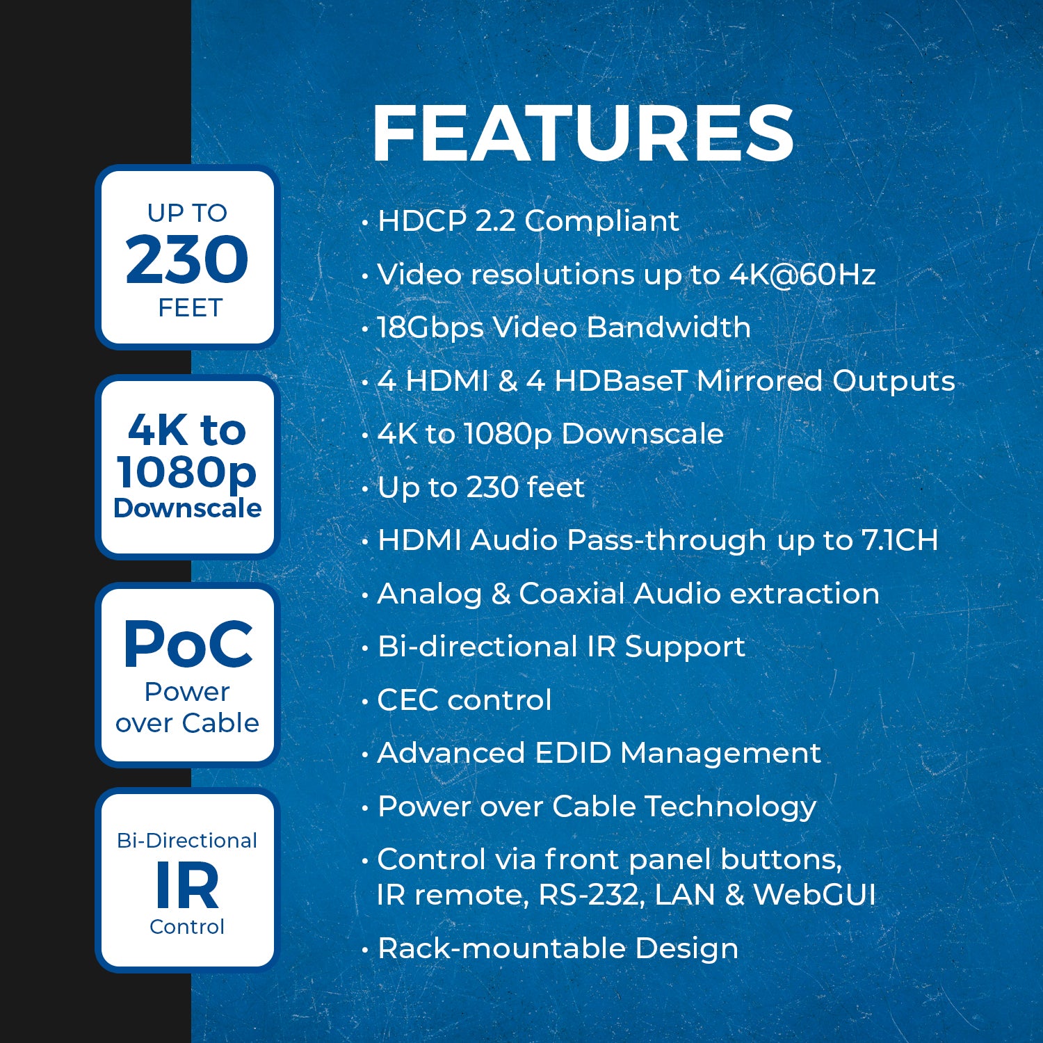 and is compliant with HDMI 2.0b and HDCP 2.2 standards. This matrix extender can extend HDMI signals up to 230 feet. Packed with a video bandwidth of 18Gbps, it also allows for seamless pass-through of HDR, HDR10, HDR10+, Dolby Vision, and HLG. For displays that don’t support 4K resolution, this matrix extender can downscale the resolution to 1080p on all output ports. This matrix extender supports a wide range of audio formats up to 7.1 channels, including LPCM, Dolby TrueHD, and DTS-HD Master Audio, with audio extraction through analog and coaxial outputs simultaneously. It is equipped with bi-directional IR control allowing the control of the source device from the receiver’s location and vice versa. Its Power over cable technology enables powering up the setup through only one power adapter connected to the transmitter. The unit can be controlled via the front panel buttons, remote control, RS-232, LAN, or the WebGUI interface. With its rack-mountable design, integration into both residential and commercial setups becomes easy.