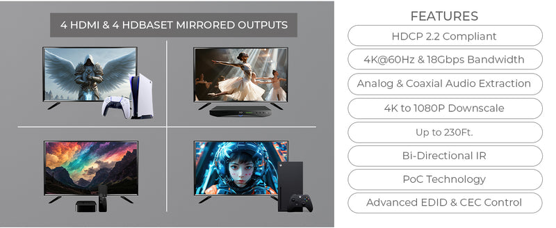 - 4 HDMI outputs and 4 HDBaseT mirrored outputs