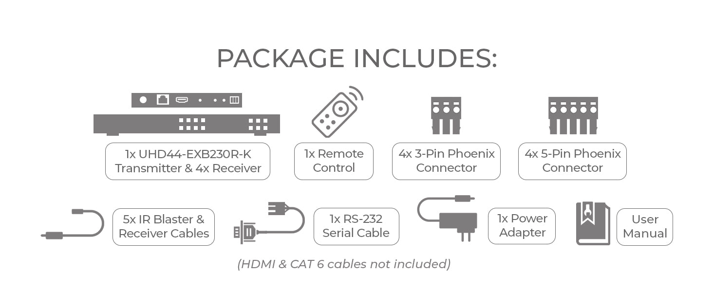 The UHD44-EXB230R-K is a 4K HDMI Matrix extender that distributes media signals from four inputs to four distant displays. It supports video resolutions up to 4K@60Hz