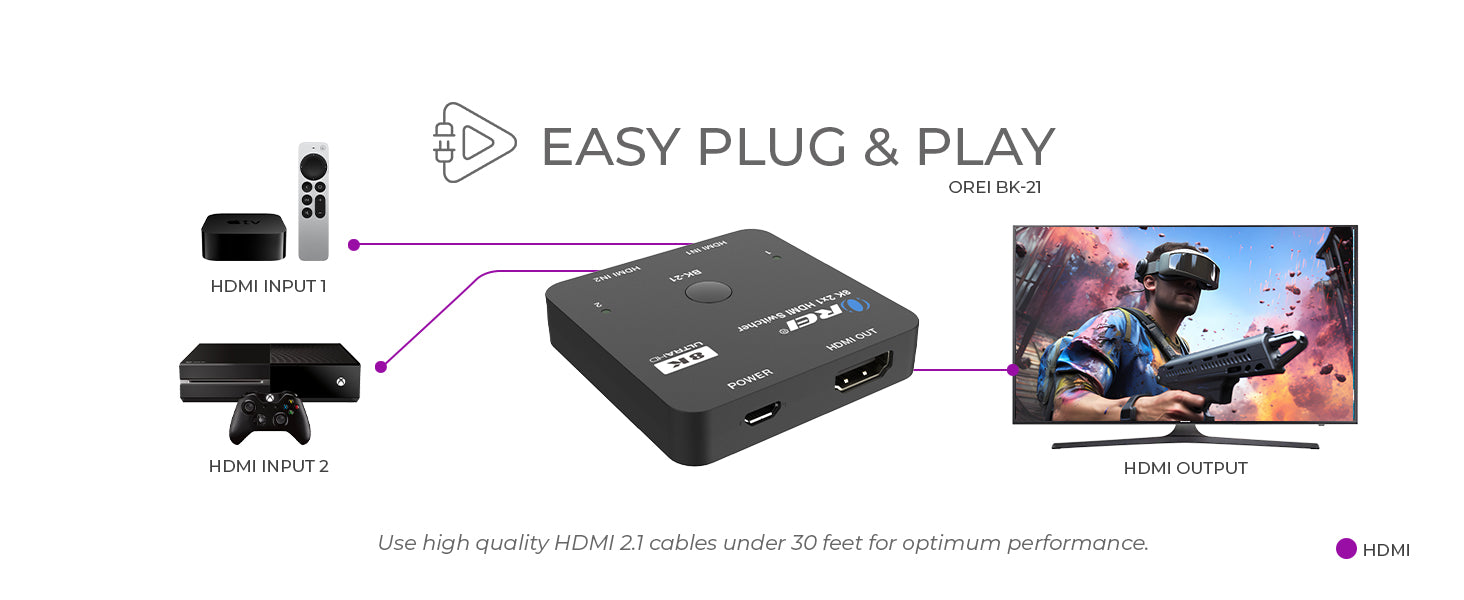The BK-21 2x1 HDMI switch allows you to connect two HDMI devices to a single display and switch between them effortlessly. Choose between automatic input sensing or manual selection using the top-panel button for instant control. This HDMI selector is perfect for streamlining your entertainment setup, whether you're using a game console, streaming stick, or media player.