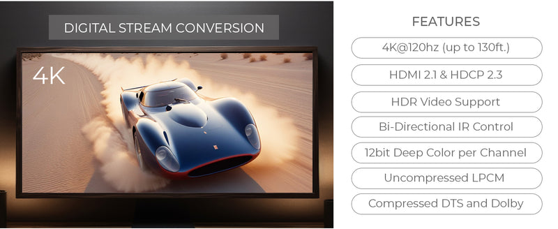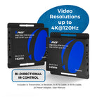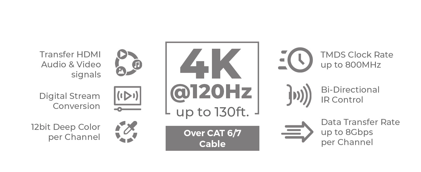Supporting video resolutions up to 4K@120Hz YUV 4:4:4 with DSC, 12-bit Deep Color, and HDR, it delivers stunning visual clarity and detail across a single Cat6/6a/7 cable up to 130 feet (40 meters).