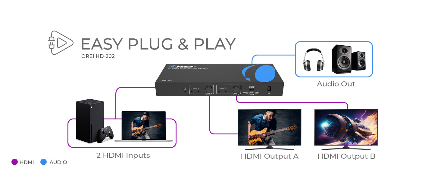 With onboard EDID management and a compact plug-and-play design, the HD-202 is ideal for home theaters, classrooms, or commercial AV systems.