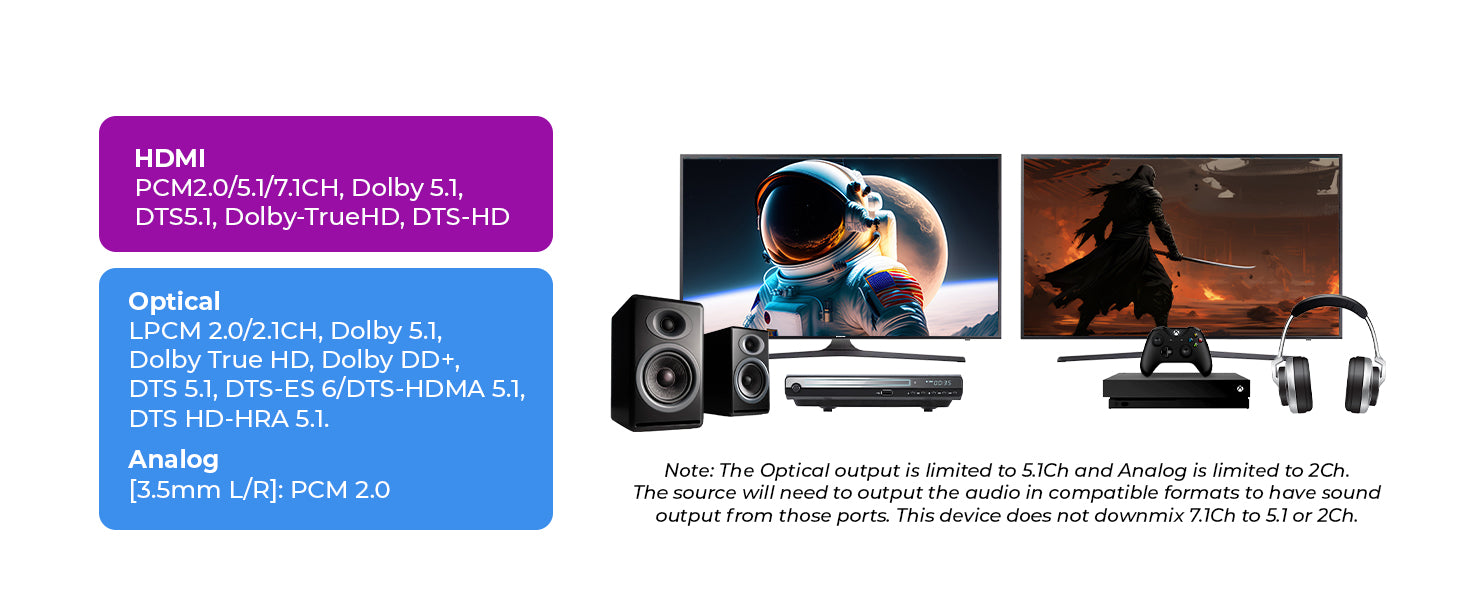 Audio can be extracted from Output A via Optical and Analog (3.5mm) ports. It supports LPCM 2.0/2.1CH, Dolby Digital 5.1, Dolby TrueHD, Dolby DD+, DTS 5.1, DTS-ES 6, DTS-HD MA 5.1, and DTS HD-HRA 5.1 formats. The analog output delivers PCM 2.0 audio.