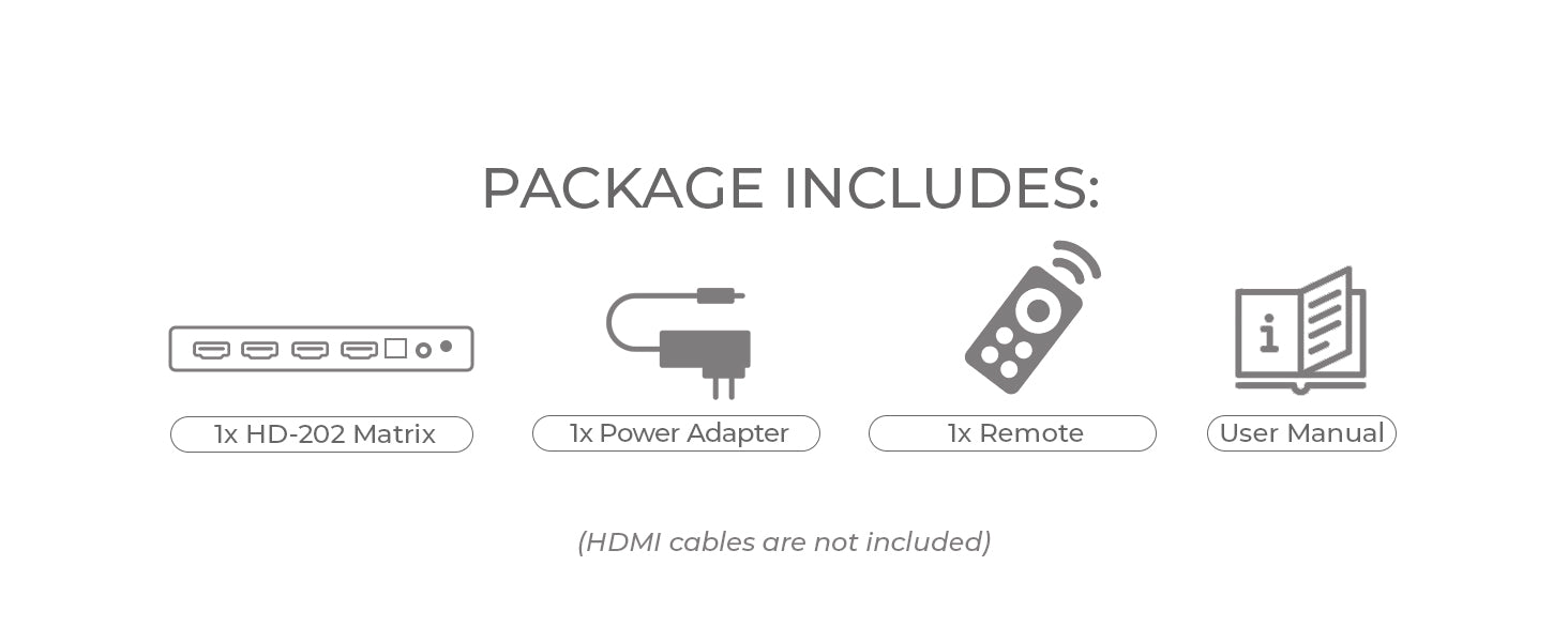 The HD-202 Matrix Switch is a 2x2 HDMI matrix designed to route two HDMI sources to two displays independently or simultaneously. It enables flexible switching between sources using front panel buttons or the included remote control.