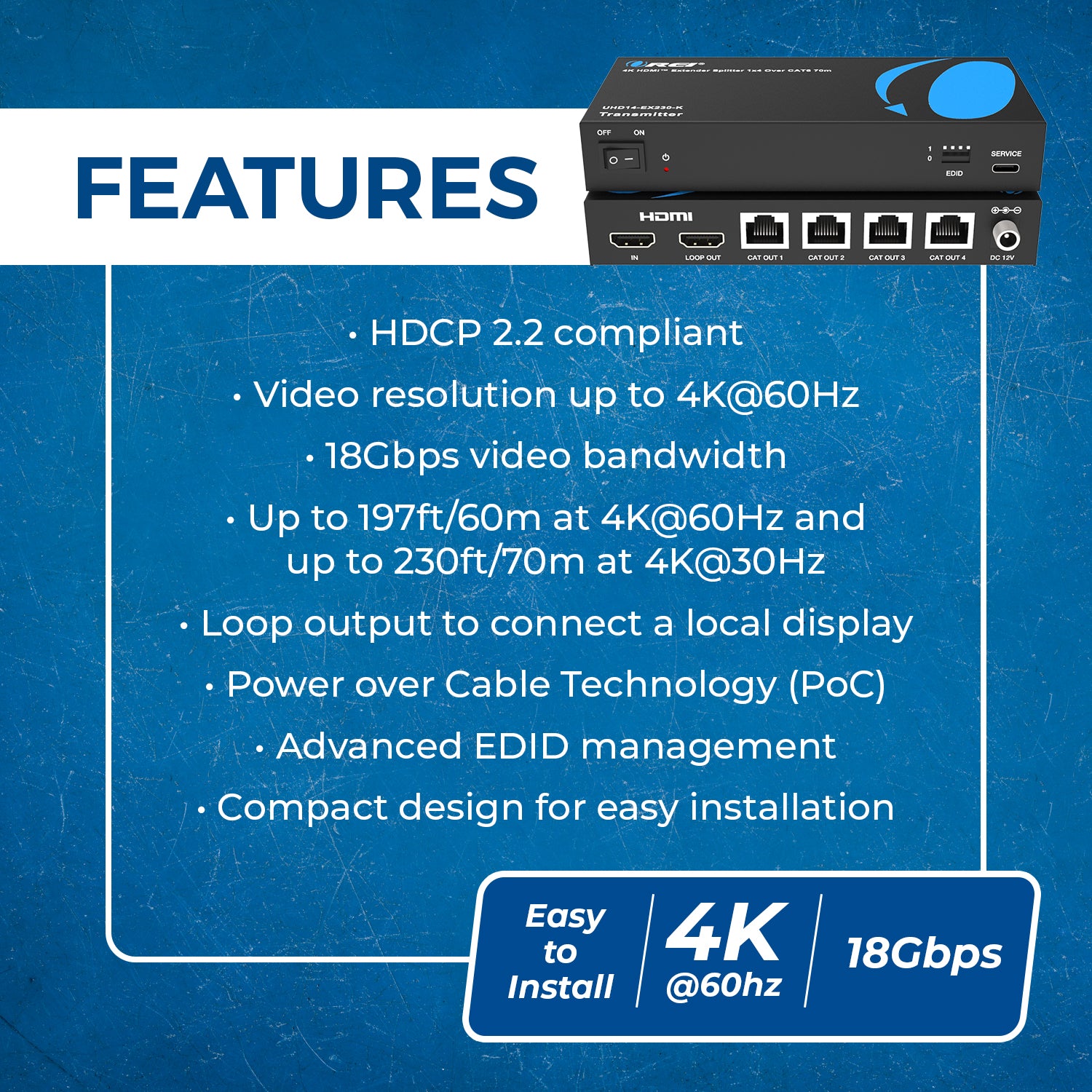 4K@60Hz 1x4 HDMI™ Extender Splitter (Loop) - 230ft (Cat6) - (UHD14-EX230-K)