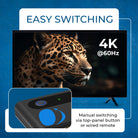 Input switching is easy and accessible via the top-panel button or the included wired remote control. Whether you’re working from home, managing a dual-system setup, or outfitting
