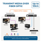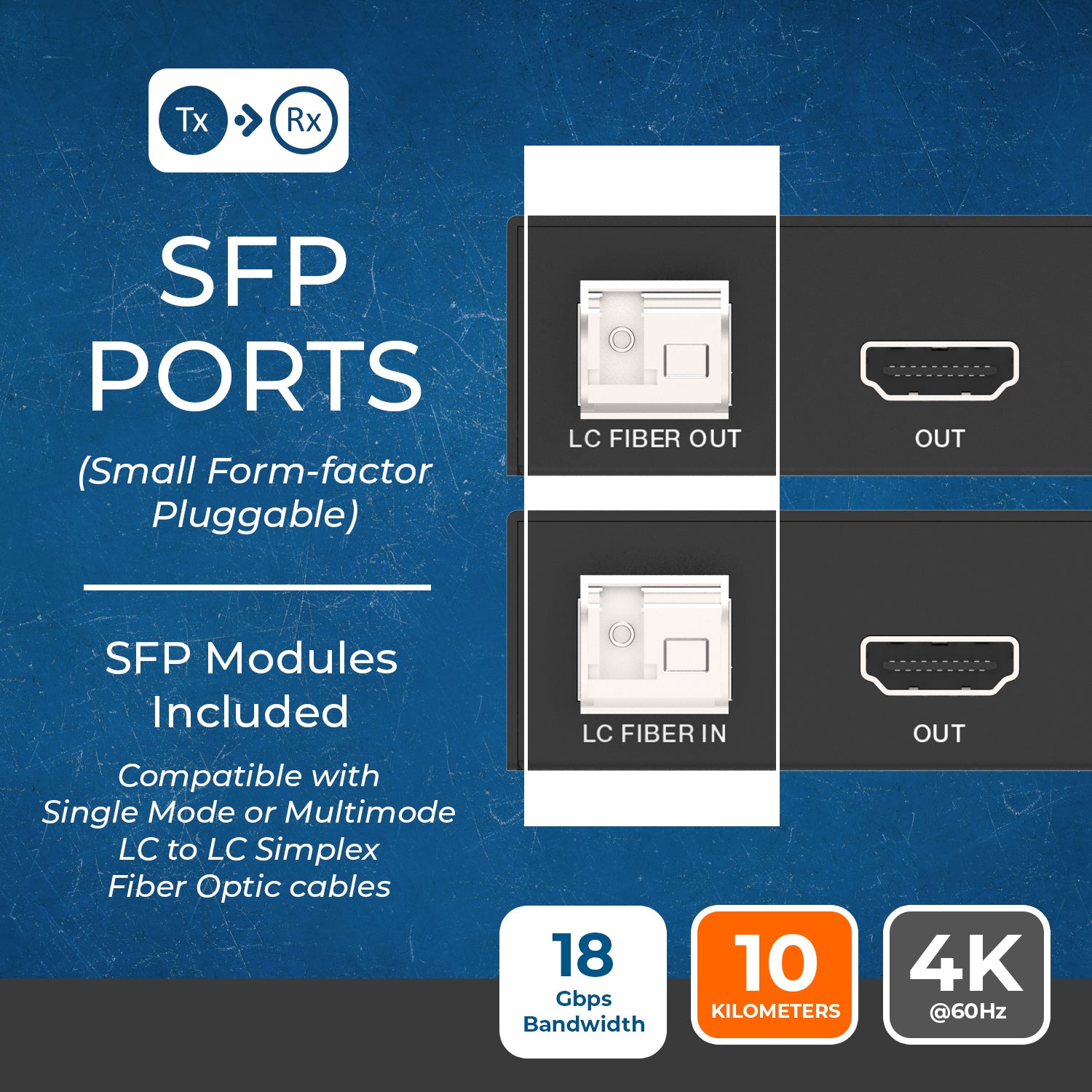 - Ultra-Long-Distance Transmission – Extends HDMI™ signals up to 10km over single-mode fiber cable. Multi-mode fiber supported with SFP modules for distances up to 300m (OM4).