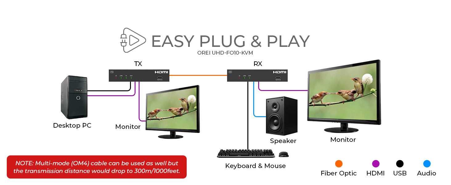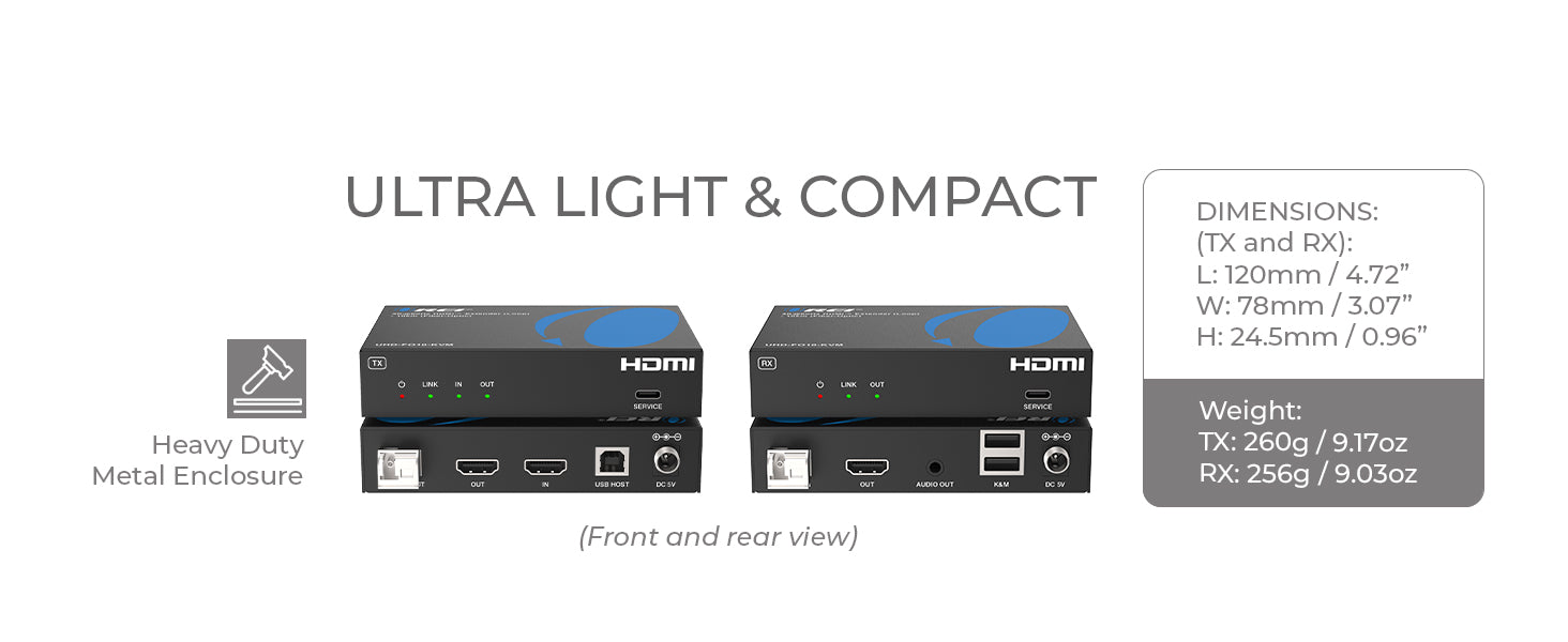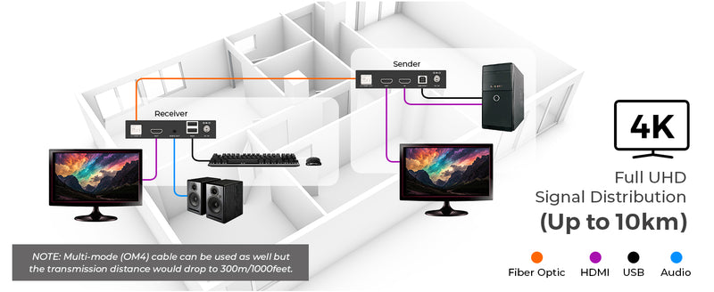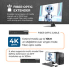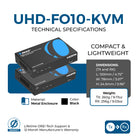 The UHD-FO10-KVM is a professional-grade HDMI™ extender engineered for ultra-long-distance AV signal transmission. Utilizing single-mode fiber optic technology, it delivers uncompressed HDMI™ signals up to 10km with exceptional stability and clarity. Supporting video resolutions up to 4K@60Hz 4:4:4 with full 18Gbps bandwidth, it ensures sharp visuals, accurate color reproduction, and zero signal degradation. Multi-mode fiber connectivity is supported up to 300m (OM4) when used with compatible SFP modules.