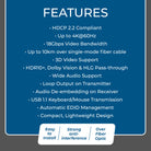 Designed for modern AV environments, the extender is fully HDCP 2.2 compliant and supports advanced HDR formats including HDR10+, Dolby Vision, and HLG, along with 3D video pass-through. These features maintain high dynamic range, deep contrast, and enhanced brightness across long-distance transmission. It is ideal for professional displays, digital signage, and high-resolution video distribution systems where image integrity is critical.