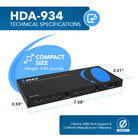 Supporting HDMI 2.0 and HDCP 2.2, the HDA-934 delivers up to 4K@60Hz resolution with full support for HDR formats including HDR10, HDR10+, Dolby Vision, and 3D. With a high-speed video bandwidth of 18Gbps and audio support for Dolby Atmos and DTS:HD, it ensures high-performance AV distribution.