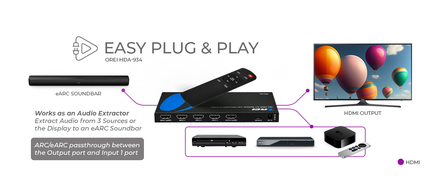 The HDA-934 is an advanced HDMI audio extractor and switch designed to simplify audio routing to ARC/eARC soundbars. It features 3 HDMI inputs, 1 HDMI ARC/eARC output to a display, and 1 HDMI ARC/eARC port for connecting a soundbar. The device allows you to extract audio from connected HDMI sources or directly from a compatible ARC/eARC TV.