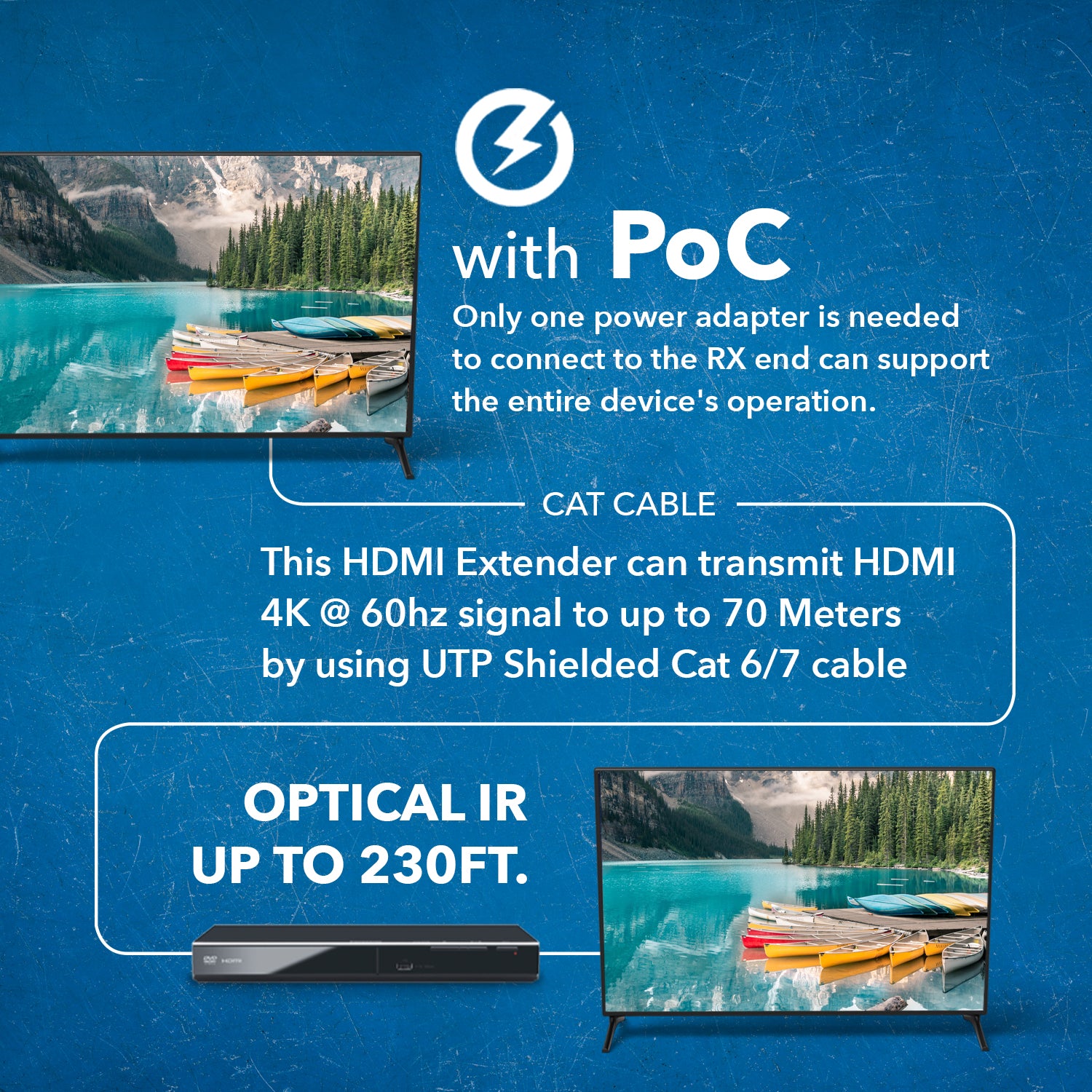 - Extends HDMI up to 230 ft (70 m) over a single Cat6/7 cable