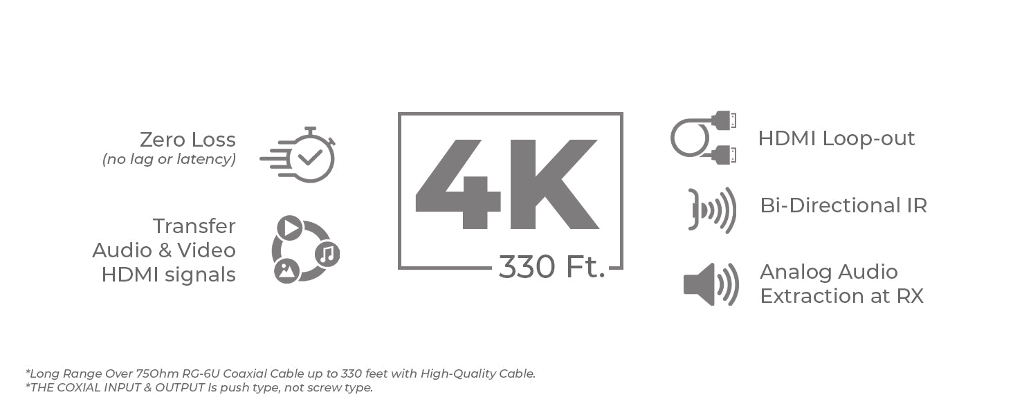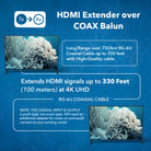 4K@60Hz Extension up to 330 ft – Transmits ultra-high-definition video over a single RG-6 coaxial cable with zero signal loss.