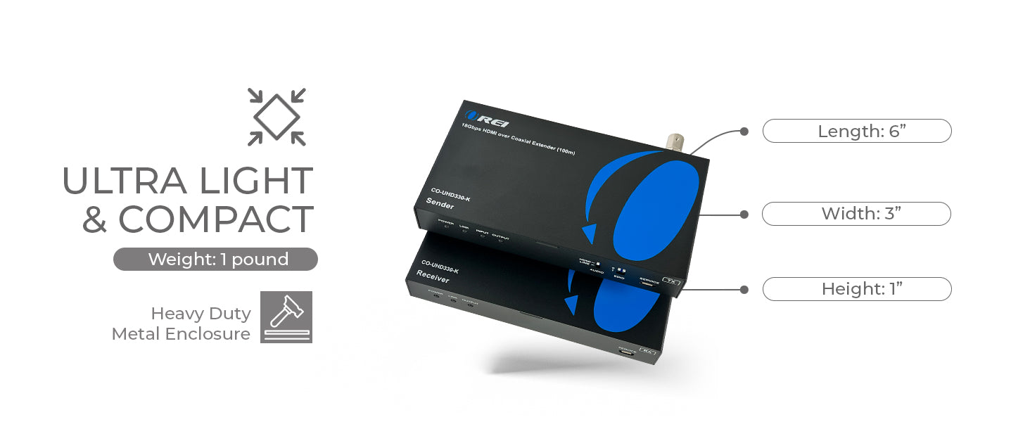 The CO-UHD330-K is a professional HDMI 2.0 extender designed to transmit 4K@60Hz signals over a single 75 Ohm RG-6 copper coaxial cable up to 330 feet (100 meters) without any signal degradation. Compliant with HDMI 2.0 and HDCP 2.2 standards, it ensures high-quality AV delivery across long distances while maintaining full compatibility with modern display systems.