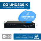 The CO-UHD330-K is a high-performance HDMI 2.0 extender designed to transmit 4K@60Hz signals up to 330 feet (100 meters) using a single RG-6 75 Ohm coaxial cable. With support for HDCP 2.2 and zero compression, it delivers uncompressed, ultra-high-definition video and multi-channel audio without signal degradation, making it ideal for long-distance AV applications.