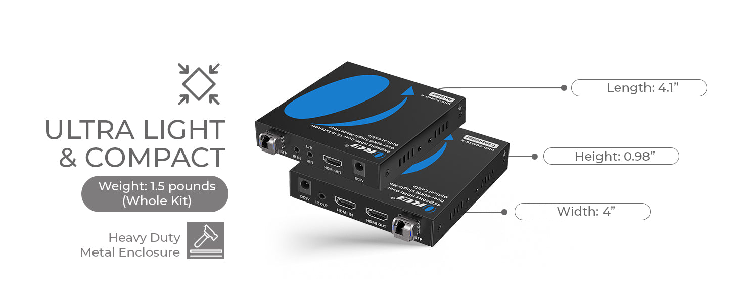 Built for long-term, 24/7 performance, the UHD-FOM40-K features a compact, industrial-grade design suitable for demanding use. Its Micro USB port allows for easy firmware upgrades, ensuring future compatibility and extended product life. Whether you’re deploying HDMI over long distance, building a 4K HDMI over fiber solution, or implementing a high-end infrared remote extender setup, this device delivers stable, professional-grade performance you can count on.