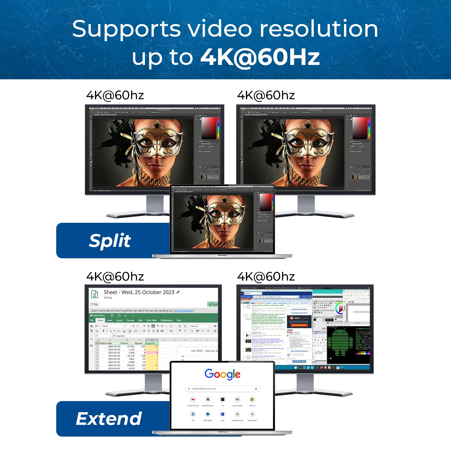 The SplitXtend SX-2C4K-85 lets you extend or mirror your screen to two external 4K@60Hz monitors for crystal-clear visuals and maximum screen real estate. Whether you’re managing spreadsheets, editing media, or conducting virtual meetings, this powerful display to HDMI adapter provides an immersive, high-performance workspace ideal for multitasking professionals.