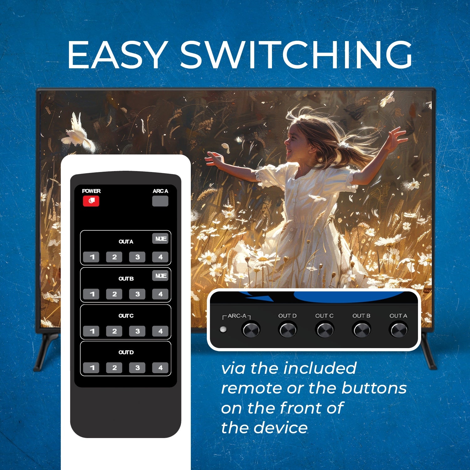 ARC Support on Output A – Enables audio return from compatible TVs to external audio devices via Optical or 3.5mm outputs.
