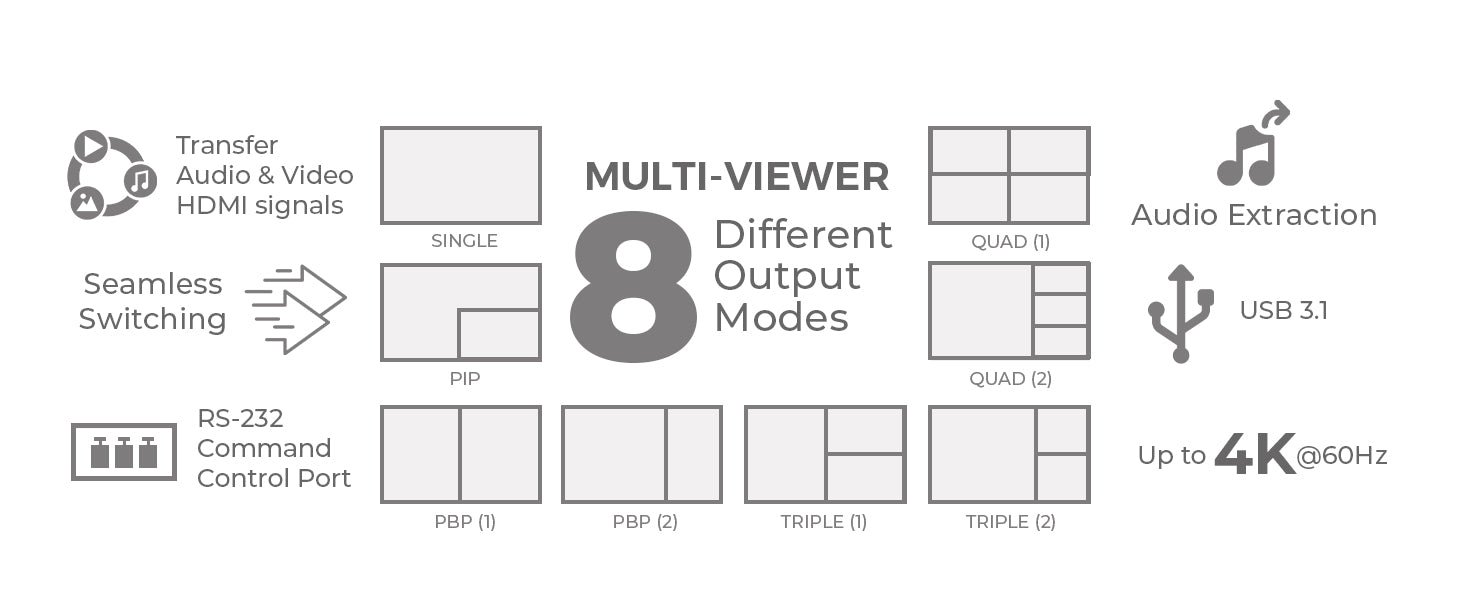 Fully compliant with HDMI 2.0 and HDCP 2.2 standards, it features 7 different multiview display modes and supports audio extraction through both Optical and L/R outputs. With a built-in 3-port USB 3.1 Gen 1 hub, it provides high-speed data transfer and versatile peripheral connectivity.