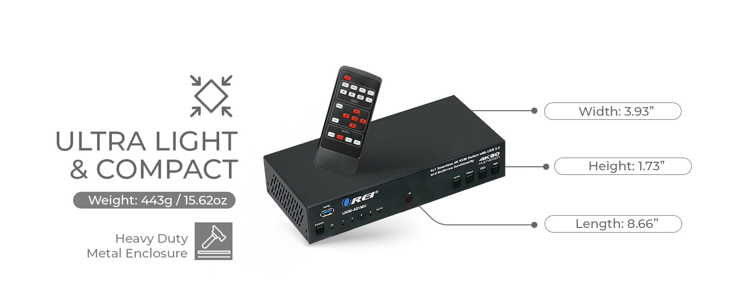 Control is effortless through front panel buttons, IR remote, keyboard/mouse hotkeys, OSD menu navigation, or RS-232 commands. Its compact design ensures easy setup in any environment—ideal for professional workstations, security, or personal productivity setups.