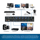 With seven display modes including quad-view, picture-in-picture, and full-screen, this multiviewer with KVM switch adapts to your workflow instantly. Enjoy seamless switching between connected systems using front panel buttons, keyboard hotkeys, or IR remote—perfect for multitasking across multiple devices without delay or screen blackout.