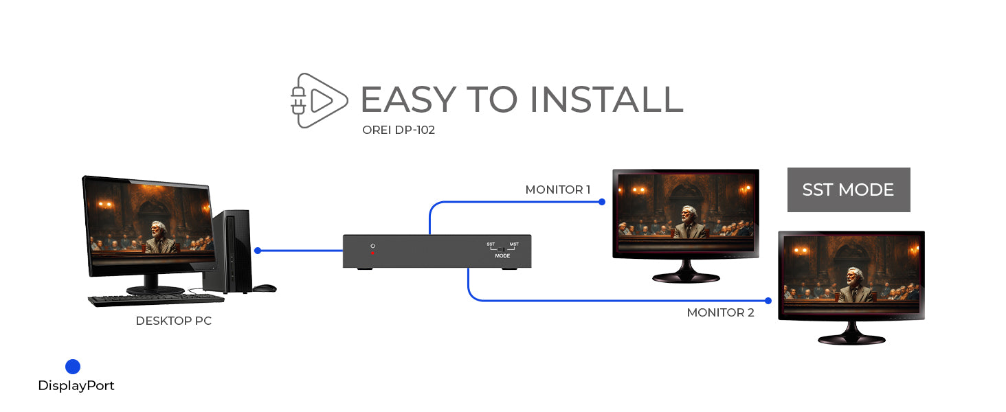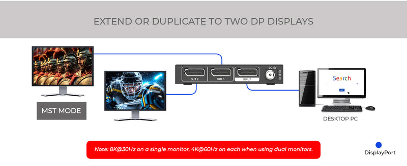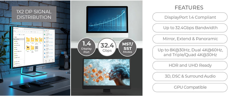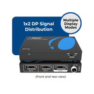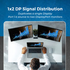 1x2 DP Signal Distribution – Duplicates a single Display Port 1.4 source to two DisplayPort monitors.