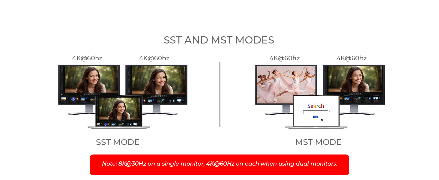 MST & SST Modes – Supports Multi-Stream Transport (MST) for extended displays and Single-Stream Transport (SST) for mirrored output.