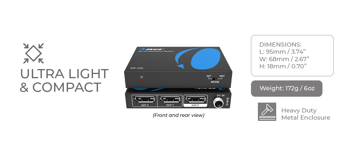 DP-102 is a high-performance 1x2 DisplayPort 1.4 Splitter designed to distribute a single DisplayPort source signal to two independent displays simultaneously. With support for advanced display configurations such as mirror, extended desktop, and panoramic video wall modes, this device delivers seamless signal distribution and pristine video performance.
