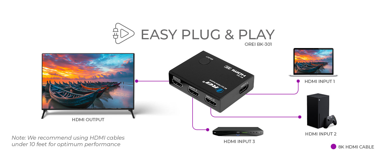 The OREI BK-301 is a sleek and powerful 3x1 HDMI switch that lets you connect and switch between three HDMI sources on a single 8K or 4K display. Whether it's a gaming console, media player, or streaming device, this HDMI port switch provides seamless control, making it ideal for home theaters, desktops, or professional AV setups.